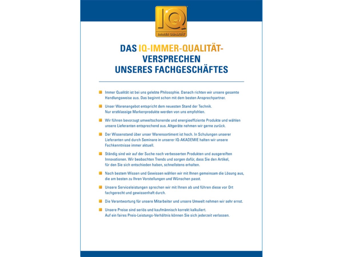 IQ – Immer Qualität. Das ist nicht nur unser Versprechen an Sie. Das ist auch der Anspruch, den wir selbst an uns als Fachhändler stellen.